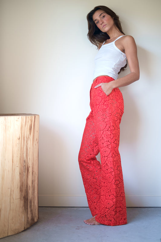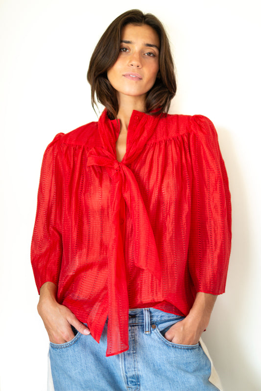 Stella Nova-Pointelle High-Neck Bow Blouse in Flame Red