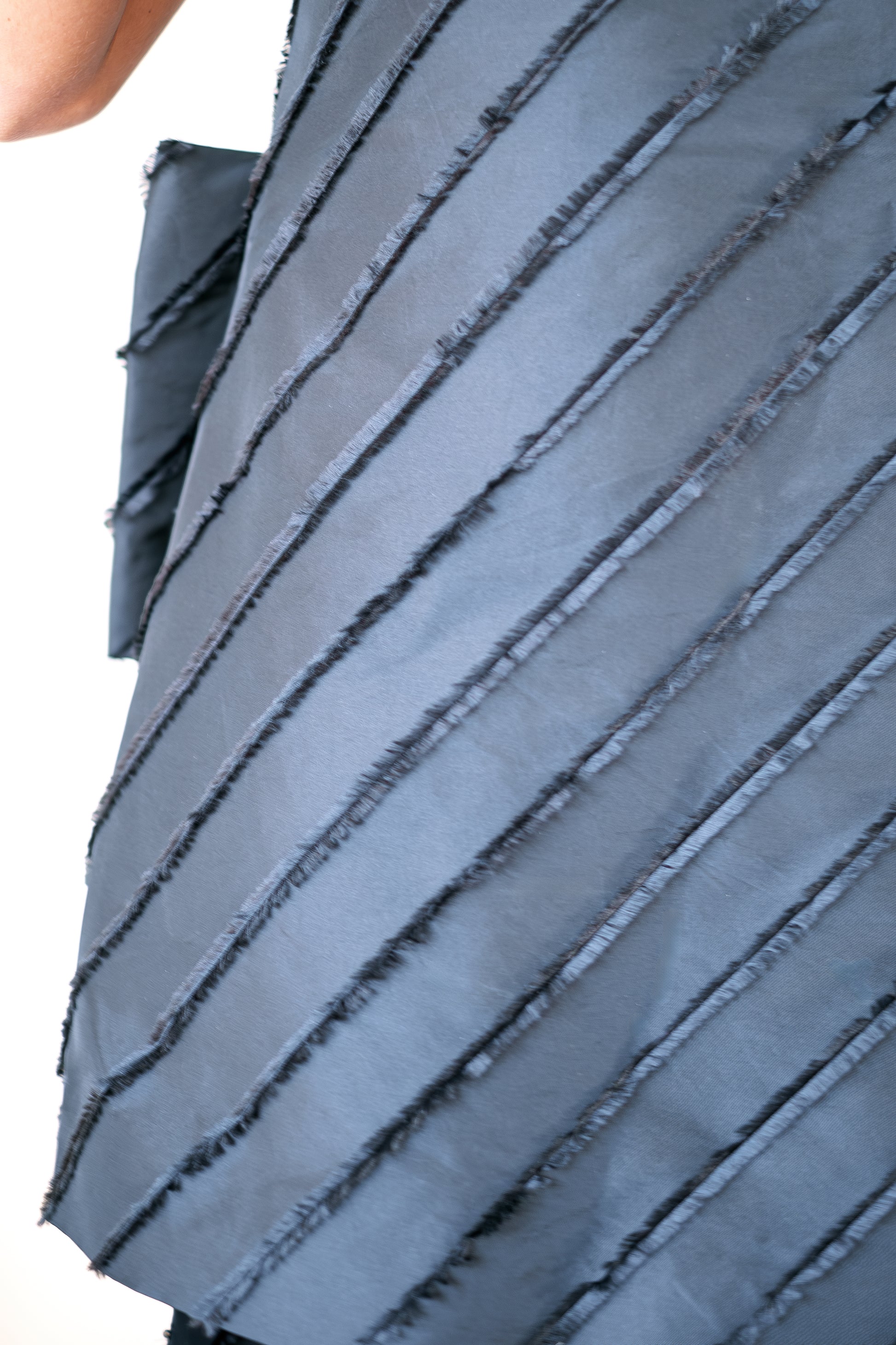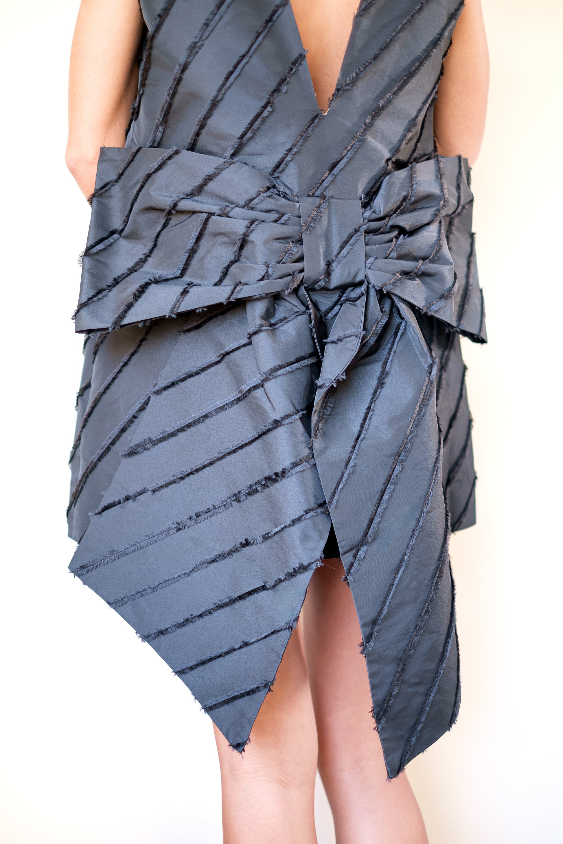 Sleeveless dress with a round neckline and textured diagonal stripes. The back has a deep V-shape, and the dress is accented with a large bow detail at the back.